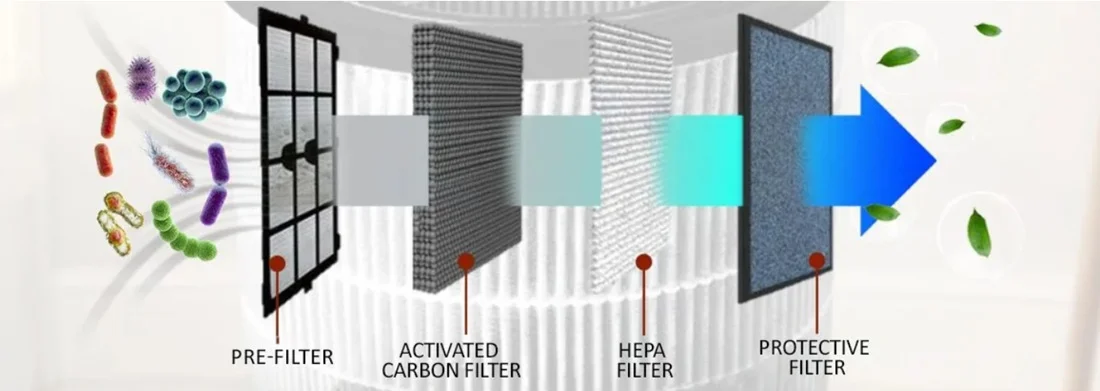 تصفیه هوا به کمک فیلتراسیون قوی صورت می گیرد. گری هوشمند GCF350 از فیلتر کمپلکس HEPA-C برای این منظور استفاده کرده است. این فیلتر 4 لایه دارد که از شروع چرخه تصفیه تا پایان را همراه می شود. فیلتر کربن فعال، فیلتر HEPA از مهم ترین اجزاء این فیلتراسیون به شمار می روند. تصفیه هوا گری GCF350 بسیار کارآمد 99% هر گونه آلودگی و آلرژی و حساسیت را از بین می برد. دوام فیلتر بالا است و بیش از یکسال برای تعویض فیلتر زمان باقی است. همچنین در نظر داشته باشید که در کنار تصفیه هوا می توان به از بین بردن بوی بد نیز توجه داشت. در واقع گری در ساخت این فیلتر از اولین لایه با به دام انداختن ذرات ریز می تواند مسیر را عاری از هر گونه میکروب گرداند. در ضمن روی نمایشگر نشانی برای تعویض فیلتر و بهبود عمبکرد نیز وجود دارد.