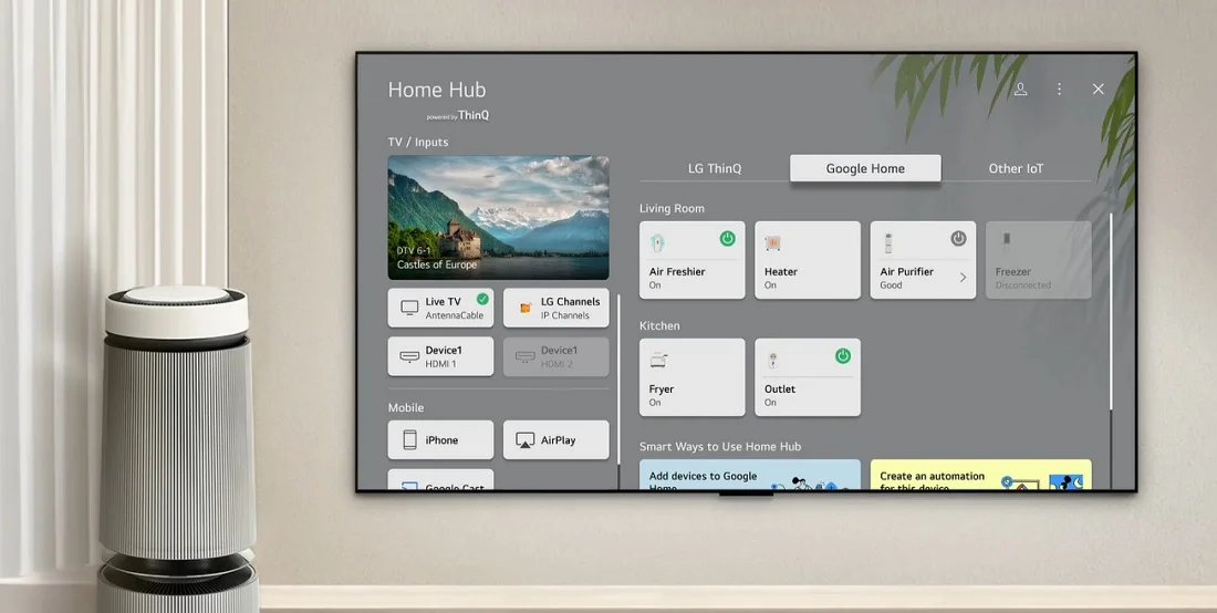 بخش اسمارت یکی از قسمت هایی است که نزد کارشناسان نیز از جذابیت های خاصی برخوردار است. تلویزیون های 2025 از سری webOS روان تر با قابلیت های منحصر به فردی برخوردار است. اگر بهتر و بیشتر بحث را باز کنیم باید به قسمت ها مختلف آن بپردازیم. این ساختار شامل سه بخش، اشتراک های رایگان، فناوری های کاربردی و امکان دانلود و اجرا محتوا است. قبل از هر چیزی باید عنوان کرد که فروشگاهی خاص برای دانلود و اجرا برنامه ها وضع شده است. از طرفی دیگر تلویزیون فناوری های کاربردی خاصی برقرار شده است. AI Chatbot یکی از این موارد است که متاثر از هوش مصنوعی راه را برای جستجو صوتی باز می کند! Voice ID ارتباط را قوی می کند و تلویزیون را با صدای کاربر آشتی می دهد. ارتباط این تلویزیون با ربات های گوگل مثال زدنی است. Home Hub و Google Home به همراه وب گردی Full Web Browser از نمونه های خاصی است که صحه روی این ادعا می گذارد.