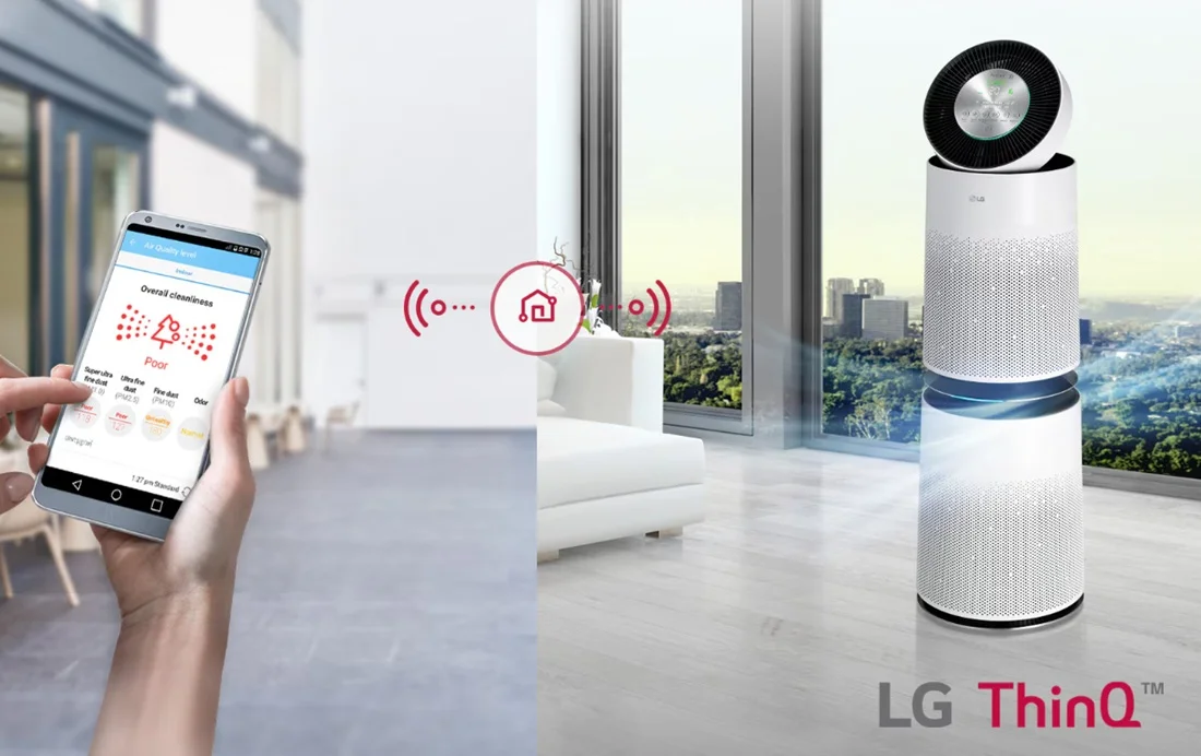 در قسمت بالا تصفیه گر ال جی AS95GDWV0 امکان اتصال وایفای وجود دارد! قابلیت اسمارت و اتصال به گوشی همراه باعث می شود که کاربری ساده میسر گردد و از طرفی دیگر کنترل از راه دور نیز برقرار شود. کافی است که اپ LG ThinQ را دانلود و اجرا کنید تا از طریق Wi-Fi اتصال به گوشی همراه را میسر سازید. با انجام این کار می توان کیفیت هوا را از راه دور چک کرد و اقدامات لازم را صورت داد. این نرم افزار دارای اعلان و آلارم هایی است که می تواند کاربردی باشد. مثلا با بالا رفتن شاخص آلودگی به کاربر اطلاع داده می شود. زمان تعویض فیلترها را بیان می کند و در کنار نظارت روی کیفیت هوا به سلامت دستگاه نیز می اندیشد. این محصول می تواند به شبکه IoT متصل شود و سایر لوازم هوشمند همچون تلویزیون کاربری تصفیه گر را دنبال کند.