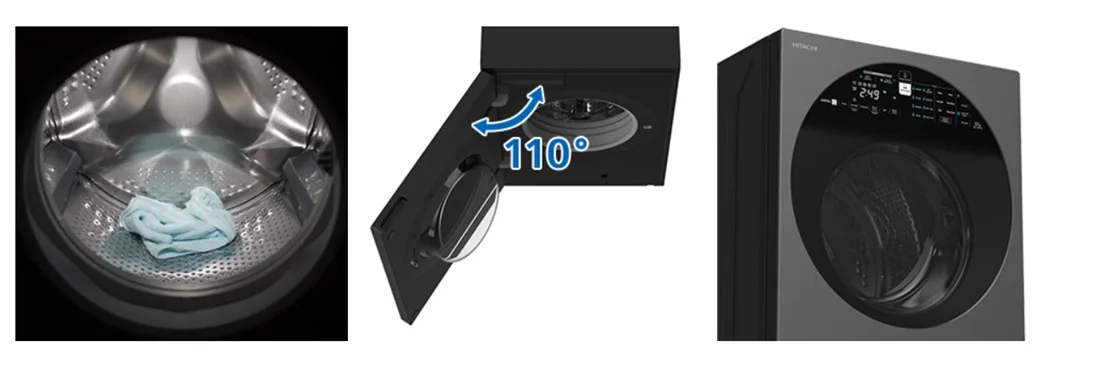 برای بررسی بیشتر محصول از طراحی شروع خواهیم کرد. ظاهر لباسشویی در دو دیدگاه مودر بررسی قرار می گیرد. دیدگاه اولیه ابعاد، وزن و کیفیت ساخت و دیدگاه بعدی کارایی و حس مدرن بودن آن است. لباسشویی هیتاچی BD-120XGV به رنگ دودی عرضه شده است و وزن آن 68 کیلوگرم است. از لحاظ ابعاد نیز ارتفاع و عمق و عرض به ترتیب 600*650*850 میلی متر می باشد که قابلیت قرار گیری به صورت توکار و روکار را دارا می باشد. اما از لحاظ کارایی درب در جلو قرار دارد و به سمت چپ باز می شود. زاویه باز شدن درب 110 درجه است که امکان بارگذاری ساده را ممکن می بخشد. شاخص ترین بخش طراحی به نمایشگر لمسی متصل به درب لباسشویی بر می گردد. هیتاچی BD-120XGV پیشانی درب را به نمایشگری با پیش زمینه مشکی و نور LED قرار داده است که فعالیت آن لمسی است. استقرار و وضعیت این لباسشویی نشانی از کیفیت و وقار با چاشنی عملکرد منحصر به فرد آن است.